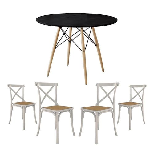 Conjunto De Mesa Eiffel Redondo Tampo De Madeira 90cm Preto Com 4 Cadeiras Katrina aço Branca Assento BegeA sua cozinha ou sala de jantar ficará completa com esse lindo Conjunto de Mesa e Cadeiras! Contendo um design de móveis moderno, elegante e com uma ousada combinação de cores, esse é um kit que certamente é uma solução que esbanja estilo, elegância e muito requinte.O conjunto tem em sua diversificada estrutura de materiais com altíssima qualidade, que proporciona muito mais resistência, mesmo com o passar dos anos, e com seus 4 assentos Katrina Aço é ideal para um jantar em família sem abrir mão do conforto. O Kit acompanha versatilidade e combina com vários tipos de decoração, o que dá mais praticidade em sua casa.Informações técnicas Conjunto:Conteúdo da Embalagem: 01 Mesa e 04 Cadeiras (Embalados Separadamente).Instruções/Cuidados: Limpar com pano seco ou levemente umedecido com água.Necessita de Montagem? Sim.Mesa:Modelo: Eiffel WoodTipo: RedondaCor do tampo: PretoCor da base dos pés: Wood (Madeira)Material do tampo: MadeiraMaterial dos pés: MadeiraDimensões: Altura: 76 cm // Largura: 90 cm // Profundidade: 90 cmCadeiras:Modelo: KatrinaCor: Branca e BegeMaterial da estrutura: Aço com Pintura E-PoxMaterial do assento: Espuma D14 com Revestimento em Corano.Dimensões: Altura: 90 cm // Largura: 50 cm // Profundidade: 55 cmConjunto de Mesa Eiffel Redondo Tampo de Madeira 90cm Preto com 4 Cadeiras Katrina Branca Assento Be