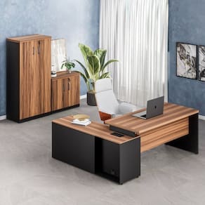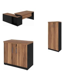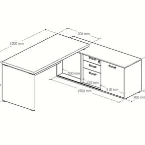 Conjunto de mesa em L150x150cm, com arm?rio baixo com chave e arm?rio alto, especial para voc? que procura um ambiente moderno, e de muita qualidade. Produzido com Tampo confeccionado em chapa de m?dia densidade MDP com part?culas selecionadas de madeira de reflorestamento, aglutinadas e consolidadas com resina sint?tica e termo estabilizadas sob press?o, com 40mm de espessura, revestido em ambas as faces com filme termo prensado melam?nico, com espessura m?nima de 0,2mm (BP). O mesmo é produzido com sistema de engrossuramento com pinos em a?o zincado 35 mm (compr.) x 1 mm (esp.) para fixa??o das travessas. Acabamento: BP Altura do Conjunto: 161.5 cm Ambiente: null Ambiente Principal: Escrit?rio Cor: Marrom/Preto Informa??o Complementar: 1x Mesa para Escrit?rio em L Din?mica com Arm?rio Lateral Porta de Correr Marrom/Preto Largura: 150 cm Altura: 73,5 cm Peso: 80,589 kg Profundidade: 45 cm Necessita Montagem: Sim