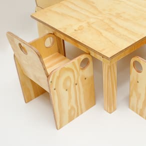 Fabricado em compensado de pinus com pintura em verniz atóxico, priorizou-se manter a característica da cor da madeira (natural), como forma de neutralizar os diversos espaços em que pode ser inserida. Ideal para residências e espaços escolares.