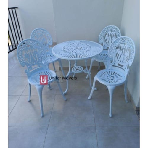 Especificações: 1 Mesa: 70 cm de altura x 75 cm de diâmetro. 4 Cadeiras: 92 cm de altura x 38 cm de diâmetro. Cor: Branco. Material: Alumínio fundido. Tipo de pintura: Eletrostática. Vendemos almofadas separadamente. Requer montagem.