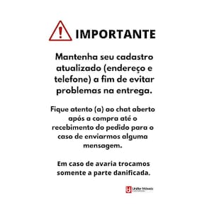 Observações: As imagens são meramente ilustrativas não acompanhando objetos e enfeites. Todos os produtos vão desmontados e embalados, mas não se preocupe, são de fácil montagem. A montagem é de responsabilidade do cliente. Ao receber o produto verifique as condições das embalagens, havendo algum dano descreva no comprovante de recebimento. Em caso de dano trocamos somente a peça danificada. Confira as dimensões do produto e certifique-se de que passarão normalmente por supostos elevadores, portas, escadas ou corredores de sua moradia. Entregamos os produtos até a frente de sua moradia, ou seja, até sua porta se for casa ou portaria se for apartamento. Não nos responsabilizamos no ato da entrega, caso o produto necessite de montagem, subir ou descer escadas ou elevadores, passar por corredores estreitos, transporte por guincho para apartamentos. Confira o produto no ato da entrega.
