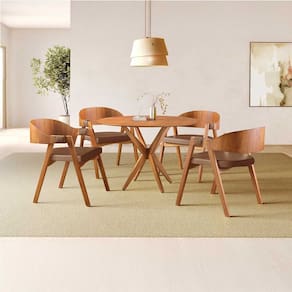 As Cadeiras Luna completam o conjunto com seu encosto curvo em madeira e assento estofado, garantindo conforto e elegância em cada refeição.