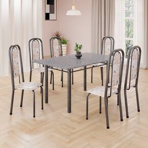 Este conjunto de mesa retangular e 6 cadeiras oferece estilo e praticidade. Com estrutura tubular em aço para estabilidade, o tampo em pedra granito adiciona sofisticação e resistência a riscos e manchas. As cadeiras combinam harmoniosamente com a mesa, garantindo conforto com estofamento. Ideal para diversos espaços, é perfeito para receber convidados ou desfrutar de refeições em família, criando um ambiente acolhedor e elegante.