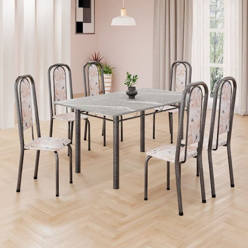 Este conjunto de mesa retangular e 6 cadeiras oferece estilo e praticidade. Com estrutura tubular em aço para estabilidade, o tampo em pedra granito adiciona sofisticação e resistência a riscos e manchas. As cadeiras combinam harmoniosamente com a mesa, garantindo conforto com estofamento. Ideal para diversos espaços, é perfeito para receber convidados ou desfrutar de refeições em família, criando um ambiente acolhedor e elegante.