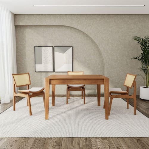 O Conjunto de Mesa Retangular Tarsila com 4 Cadeiras Veronica é a combinação perfeita de elegância e praticidade. A mesa retangular oferece espaço amplo, ideal para refeições íntimas ou encontros menores. As cadeiras Veronica, com design moderno e estofamento confortável, completam o conjunto com sofisticação. Feito com materiais de alta qualidade, este conjunto é uma adição durável e elegante para qualquer lar. Transforme seus momentos de refeição em ocasiões especiais com este conjunto excepcional. Adquira-o agora e desfrute de refeições memoráveis com estilo. Medida da Mesa (A x L x P): 78 x 120 x 90 Peso da Mesa: 30 kg Mesa suporta até: 35.0000 Acabamento da Cadeira/Banco: Pintura Acabamento da Mesa: Verniz Acompanha Manual de Instalação: Sim Almofada do assento: Fixa Ambiente Principal: Sala de Jantar Cadeira/Banco estofada: Somente Assento Estofado Cadeira/Banco Estofada: Somente Assento Estofado Cadeira/Banco suporta até: 120.0000 codigo_ean: 7909903509906 Complexidade da Montagem: Média: pode ser montado por mais de uma pessoa e/ou necessite de maior conhecimento para montagem Cor: Champagne Cor do Produto: Champagne De Canto (Canto Alemão): Não Design da Base: 4 Pés Enchimento do Assento: Espuma D-26 Escala de Brilho: Semi-Brilho Espessura do Tampo: 16 mm Formato do Tampo: Retangular Itens Inclusos: 1 Mesa, 4 Cadeiras, Kit Ferragem, Manual de Montagem Manual de Montagem e Instalação: https://product-hub-prd.madeiramadeira.com.br/882679/documents/423a49d4-6d87-4bcc-a7c7-f6366e07cd41etangularextensIveltarsila.pdf Material da Base da Mesa: Madeira Material da Estrutura da Cadeira: Madeira Maciça Material do Tampo: Laminado Material Principal: Eucalipto Material Principal das Cadeiras/Bancos: Madeira Maciça Medida da Cadeira/Banco (A x L x P): 83,2 x 48,6 x 62,1 Medida do Tampo (L x C x E): 120 x 90 x 1,6 Mesa Extensível: Sim Necessita Montagem: Sim Origem do Produto: Nacional Peso da Cadeira/Banco: 8,4 kg Possui Apoio para Braços: Não Possui Apoio Para os Pés: Não Possui Prateleiras: Não Possui Suporte Giratório: Não Possui Vidro: Não Quantidade de Cadeiras: 4 Quantidade de Lugares: 04 Recomendações de Uso, Manutenção e Limpeza: Recomenda-se o uso em salas de jantar, para limpesa utilizar pano levemente umedecido Revestimento da Cadeira/Banco: Poliéster Sistema de Montagem: Parafusos Tipo de Assento: Fixo Tipo de Encosto: Fixo