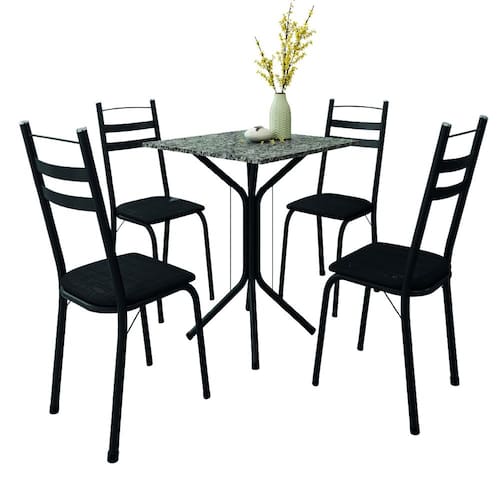 O Conjunto Sala de Jantar Mesa Leia com 4 Cadeiras, foi desenvolvido para trazer ainda mais beleza e conforto para o seu lar. Possui tampo quadrado em granito resistente a altas temperaturas, e as cadeiras são revestidas em tecido sintético de fácil limpeza. Ainda conta com a base da mesa e das cadeiras de aço, garantindo resistência e durabilidade.
