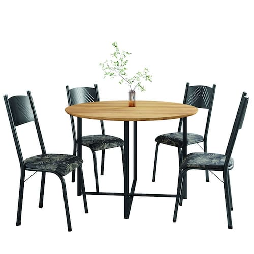 O Conjunto de Mesa Liz com 4 cadeiras possui design moderno que se adapta a qualquer ambiente. Contém tampo redondo madeirado 1m em BP resistente a riscos, manchas e umidade, e as cadeiras são revestidas em tecido sintético de fácil limpeza. Ainda conta com base da mesa e cadeiras em aço, garantindo resistência e durabilidade.