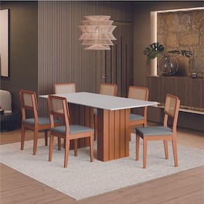 O conjunto de mesa 1,80m com 6 cadeiras Santiago é a escolha perfeita para cozinhas e salas de jantar que buscam conforto e estilo. A mesa possui tampo de vidro temperado colado, e conta com base dupla ripada, que traz um visual moderno e sofisticado ao ambiente. As cadeiras oferecem assento acolchoado e encosto em tela, proporcionando conforto e estilo. Feito com materiais resistentes e fáceis de limpar, este conjunto é perfeito para quem busca estilo, conforto e praticidade em um único produto.