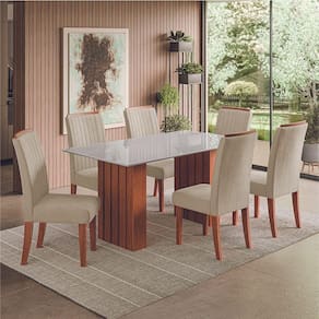 O conjunto de mesa Santiago 1,60m com 6 cadeiras Grécia é a escolha perfeita para cozinhas e salas de jantar que buscam conforto e estilo. A mesa possui tampo de vidro temperado colado, e conta com base dupla ripada, que traz um visual moderno e sofisticado ao ambiente. A Cadeira Grécia é uma peça de destaque que traz estilo e conforto para o seu espaço. Com assento acolchoado e encosto bordado com espaldar, ela é revestida com tecido Veluplus de alta qualidade, que oferece toque macio e durabilidade excepcional. Feita com materiais resistentes e fáceis de limpar, a cadeira recebe um acabamento com quatro camadas de proteção, garantindo maior durabilidade e resistência.