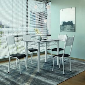 MEDIDAS: Medidas da Mesa (Base + Tampo): [ A ] = 77 cm [ L ] = 120 cm [ P ] = 75 cm Medidas da Cadeira: [ A ] = 92 cm [ L ] = 34 cm [ P ] = 41 cm PESO MESA: 64,8kg (Base + Tampo) PESO CADEIRA: 2,36 kg CADEIRAS SUPORTAM: 120kg MESA SUPORTA: 100kg Características MODELO: Conjunto De Mesa Sala de Jantar Sara Com 4 Cadeiras Tubular Granito 1,20m Artefamol MARCA: Artefamol ACABAMENTO: Liso MATERIAL: Base e Cadeira de Aço TAMPO MESA: Granito natural ASSENTO: Tecido sintético PÉS: sapatas plásticas ITENS INCLUSOS: 1 Base, 1 Tampo e 4 Cadeiras GARANTIA: 3 Meses