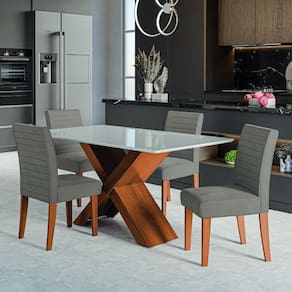 O Conjunto de Mesa Grécia com 4 cadeiras Creta é perfeito para compor sua cozinha ou Sala de Jantar. A mesa possui base com design moderno, e tampo em MDF com vidro temperado, que forma uma camada transparente de alta resistência que garante mais qualidade além de deixar seu ambiente mais sofisticado. As cadeiras oferecem assento e encosto acolchoado e revestido com tecido Veluplus de alta qualidade, a cadeira oferece toque macio e durabilidade excepcional. Feita com materiais resistentes e fáceis de limpar, garantindo maior durabilidade e resistência.