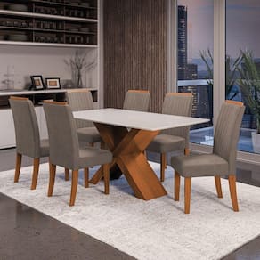 O Conjunto de Mesa com 6 cadeiras Grécia é perfeito para compor sua cozinha ou Sala de Jantar. A mesa possui base com design moderno, e tampo em MDF com vidro temperado, que forma uma camada transparente de alta resistência que garante mais qualidade além de deixa seu ambiente mais sofisticado. As cadeiras são uma peça de destaque que trazem estilo e conforto para o seu espaço. Com assento acolchoado e encosto bordado com espaldar, elas são revestidas com tecido Veluplus de alta qualidade, que oferece toque macio e durabilidade excepcional. Feitas com materiais resistentes e fáceis de limpar garantindo maior durabilidade e resistência.
