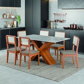 Conjunto de Mesa Sala de Jantar Tampo com Vidro 1,60m Grécia 6 Cadeiras Santiago Dobuê - Bege Médio