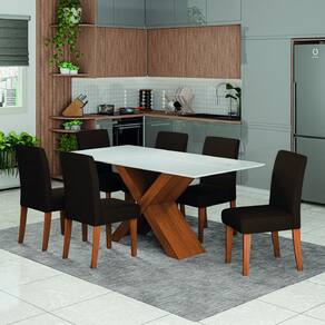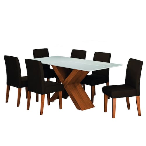 O Conjunto de Mesa Grécia com 6 cadeiras Trieste é perfeito para compor sua cozinha ou Sala de Jantar. A mesa possui base com design moderno, e tampo em MDF com vidro temperado, que forma uma camada transparente de alta resistência que garante mais qualidade além de deixar seu ambiente mais sofisticado. Já as cadeiras, com estrutura em MDF e revestimento em tecido Veluplus, oferecem um toque suave e aconchegante. Os assentos e encostos são acolchoados com espuma de alta qualidade, proporcionando máximo conforto.