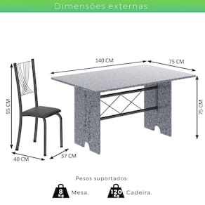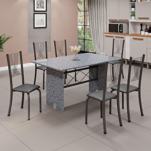 Quer deixar sua casa completa? Uma dica bacana de como transformar o seu lar, deixando-o mais receptivo e bonito? Então você precisa de móveis indispensáveis e deixar seu lar muito mais aconchegante, receptivo e sempre disponível para receber a visita de amigos, familiares e convidados. Você vai se apaixonar por este incrível Conjunto de Mesa com 6 Cadeiras Lorena. Ideal para cozinha, ele é a melhor opção para completar o espaço. Aproveite!! Medida da Mesa (A x L x P): 75 cm x 75 cm x 140 cm Peso da Mesa: 80,7 kg Mesa suporta até: 10.0000 Acabamento da Cadeira/Banco: Pintura Texturizada Acabamento da Mesa: Pintura Texturizada Ambiente Principal: Cozinha Cadeira/Banco estofada: Somente Assento Estofado Cadeira/Banco Estofada: Somente Assento Estofado Cadeira/Banco suporta até: 120.0000 codigo_ean: 7909903494103 Complexidade da Montagem: Baixa: pode ser montado por uma pessoa sozinha Cor: Preto Liso/Mart Prata Cor do Produto: Preto Liso/Mart Prata Escala de Brilho: Semi-Brilho Espessura do Tampo: 20 mm Itens Inclusos: 1 Mesa, 6 Cadeiras, Manual de Montagem e Kit Ferragens. Linha ou Coleção: Lorena Manual de Montagem e Instalação: https://product-hub-prd.madeiramadeira.com.br/880736/documents/32dec591-5c6e-4a40-9d4d-549d6d04261anualdemontagemcadeiraemesa.pdf Material da Base da Mesa: Granito Material da Estrutura da Cadeira: Aço Material do Tampo: Granito Medida da Base (A x L x P): 74 cm x 45 cm x 86 cm Medida da Cadeira/Banco (A x L x P): 98 cm x 40 cm x 37 cm Medida do Tampo (L x C x E): 75 cm x 140 cm x 2,0 cm Necessita Montagem: Sim Origem do Produto: Nacional Peso da Cadeira/Banco: 3,48 kg Possui Apoio Para os Pés: Não Quantidade de Cadeiras: 6 Quantidade de Lugares: 06 Recomendações de Uso, Manutenção e Limpeza: Usar um pano de tecido macio e seco, evitar detergentes, alvejantes e produtos químicos de limpeza; no tampo usar tecido macio levemente umedecido. Sistema de Montagem: Parafusos