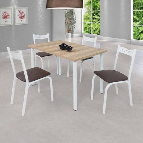 O conjunto de mesa ANA POP, é o conjunto ideal para sua casa, com tampo de 1,10m x 0,72m retangular, possui 4 cadeiras com design moderno e de fácil limpeza. Tampo de MDP/laminado: produzido a partir de chapas de madeira industrial de média densidade com revestimento de laminado plástico prensado e fundido nas duas faces através de altas temperaturas e baixa pressão. Suas 4 Cadeiras possuem assento reto e sistema de fixação com porca agarras, que proporcionam maior conforto e comodidade. Além disso suas ponteiras de proteção interna nos pés, que garante maior proteção contra riscos e ferrugem. Medida da Mesa (A x L x P): 76cm x 110cm x 72cm Peso da Mesa: 15 kg Mesa suporta até: 10 kg Acabamento da Cadeira/Banco: Pintura Epóxi Acabamento da Mesa: Pintura Epóxi Ambiente Principal: Cozinha Cadeira/Banco Estofada: Somente Assento Estofado Cadeira/Banco estofada: Somente Assento Estofado Cadeira/Banco Suporta Até: 100.0000 Cadeira/Banco suporta até: 100 kg codigo_ean: 7900288290656 Complexidade da Montagem: Baixa: pode ser montado por uma pessoa sozinha Cor: Branco/Marrom Cor da Base: Branco Cor das Cadeiras: Branco Cor do Produto: Branco/Marrom Cor do Tampo: Cinza Cor Secundária: Marrom De Canto (Canto Alemão): Não Escala de Brilho: Semi-Fosco Espessura do Tampo: 30 mm Formato do Tampo: Retangular Itens Inclusos: 1 Mesa, 4 Cadeiras, Kit Ferragens e Manual de Montagem Linha ou Coleção: Ana Pop Manual de Montagem e Instalação: https://product-hub-prd.madeiramadeira.com.br/432426562/documents/b373e90c-1c22-4e26-b240-063904c65c713335064604717648729358233.pdf Marca: Ciplafe Material da Base da Mesa: Aço Carbono Material da Estrutura da Cadeira: Aço Carbono Material do Tampo: MDP Medida da Base (A x L x P): 76cm x 110cm x 72cm Medida da Cadeira/Banco (A x L x P): 85cm x 37cm x 49cm Medida do Tampo (L x C x E): 110cm 72cm x 30cm Mesa Extensível: Não Necessita Montagem: Sim Origem do Produto: Nacional Peso da Cadeira/Banco: 3,65 kg Possui Apoio Para os Pés: Não Quantidade de Cadeiras: 4 Quantidade de Lugares: 04 Recomendações de Uso, Manutenção e Limpeza: Limpar com pano levemente umedecido. Não usar produtos abrasivos que possam danificar a superfície do móvel. Sistema de Montagem: Parafusos