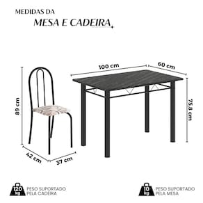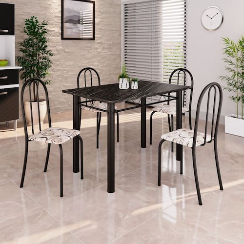 Quer deixar sua casa completa e prática? Uma dica bacana de como transformar o seu lar, deixando-o mais receptivo e bonito? Então você precisa de móveis indispensáveis para deixar seu lar muito mais aconchegante, receptivo e sempre disponível para receber a visita de amigos, familiares e convidados. Você vai se apaixonar por este incrível e moderno Conjunto de Mesa com 4 Cadeiras ANE B. Ideal para cozinha, ele é a melhor opção para completar o espaço que você desejar. Aproveite!! Medida da Mesa (A x L x P): 75,8 cm x 100 cm x 60 cm Peso da Mesa: 25,92 kg Mesa suporta até: 10.0000 Acabamento da Cadeira/Banco: Pintura Texturizada Acabamento da Mesa: Pintura Texturizada Ambiente Principal: Cozinha Cadeira/Banco estofada: Somente Assento Estofado Cadeira/Banco Estofada: Somente Assento Estofado Cadeira/Banco suporta até: 120.0000 codigo_ean: 7900288049391 Complexidade da Montagem: Baixa: pode ser montado por uma pessoa sozinha Cor: Arabesco / Preto Cor do Produto: Arabesco / Preto Cor Secundária: Bege De Canto (Canto Alemão): Não Escala de Brilho: Semi-Brilho Espessura do Tampo: 1,5 mm Estrutura do Assento: MDP Formato do Tampo: Retangular Itens Inclusos: 1 Mesa, 4 Cadeiras, 1 Kit Ferragens e 1 Manual de Montagem Linha ou Coleção: Ane B Manual de Montagem e Instalação: https://product-hub-prd.madeiramadeira.com.br/975547/documents/67b98a4b-7e49-49f3-9156-08e3e7d6575c2645257352817375705415518.pdf Marca: Soma Móveis Material da Base da Mesa: Aço Material da Estrutura da Cadeira: Aço Material do Tampo: Ardósia Medida da Cadeira/Banco (A x L x P): 89 cm x 37 cm x 42 cm Medida do Tampo (L x C x E): 60 cm x 100 cm x 1,5 cm Mesa Extensível: Não Necessita Montagem: Sim Origem do Produto: Nacional Peso da Cadeira/Banco: 3 kg Possui Apoio Para os Pés: Não Quantidade de Cadeiras: 4 Quantidade de Lugares: 04 Recomendações de Uso, Manutenção e Limpeza: Não permitir que molhe os pés da base, usar um pano de tecido macio e seco, evitar detergentes, alvejantes e produtos químicos de limpeza; no tampo usar tecido macio levemente umedecido. Sistema de Montagem: Parafusos