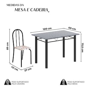 Quer deixar sua casa completa e prática? Uma dica bacana de como transformar o seu lar, deixando-o mais receptivo e bonito? Então você precisa de móveis indispensáveis para deixar seu lar muito mais aconchegante, receptivo e sempre disponível para receber a visita de amigos, familiares e convidados. Você vai se apaixonar por este incrível e moderno Conjunto de Mesa com 4 Cadeiras ANE B. Ideal para cozinha, ele é a melhor opção para completar o espaço que você desejar. Aproveite!! Medida da Mesa (A x L x P): 75,8 cm x 100 cm x 60 cm Peso da Mesa: 41,54 kg Mesa suporta até: 10.0000 Acabamento da Cadeira/Banco: Pintura Texturizada Acabamento da Mesa: Pintura Texturizada Ambiente Principal: Cozinha Cadeira/Banco estofada: Somente Assento Estofado Cadeira/Banco Estofada: Somente Assento Estofado Cadeira/Banco suporta até: 120.0000 codigo_ean: 7900288049278 Complexidade da Montagem: Baixa: pode ser montado por uma pessoa sozinha Cor: Bege / Preto Cor do Produto: Bege / Preto Cor Secundária: Bege De Canto (Canto Alemão): Não Escala de Brilho: Semi-Brilho Espessura do Tampo: 1,5 mm Estrutura do Assento: MDP Formato do Tampo: Retangular Itens Inclusos: 1 Mesa, 4 Cadeiras, 1 Kit Ferragens e 1 Manual de Montagem Linha ou Coleção: Ane B Manual de Montagem e Instalação: https://product-hub-prd.madeiramadeira.com.br/975534/documents/f5a2a7d5-2db8-46e6-9cb2-932f8d4f03d02645257352817375705415518.pdf Marca: Soma Móveis Material da Base da Mesa: Aço Material da Estrutura da Cadeira: Aço Material do Tampo: Granito Medida da Cadeira/Banco (A x L x P): 89 cm x 37 cm x 42 cm Medida do Tampo (L x C x E): 60 cm x 100 cm x 1,5 cm Mesa Extensível: Não Necessita Montagem: Sim Origem do Produto: Nacional Peso da Cadeira/Banco: 3 kg Possui Apoio Para os Pés: Não Quantidade de Cadeiras: 4 Quantidade de Lugares: 04 Recomendações de Uso, Manutenção e Limpeza: Não permitir que molhe os pés da base, usar um pano de tecido macio e seco, evitar detergentes, alvejantes e produtos químicos de limpeza; no tampo usar tecido macio levemente umedecido. Sistema de Montagem: Parafusos