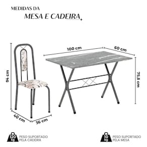 Quer deixar sua casa completa e prática? Uma dica bacana de como transformar o seu lar, deixando-o mais receptivo e bonito? Então você precisa de móveis indispensáveis para deixar seu lar muito mais aconchegante, receptivo e sempre disponível para receber a visita de amigos, familiares e convidados. Você vai se apaixonar por este incrível e moderno Conjunto de Mesa com 4 Cadeiras. Ideal para cozinha, ele é a melhor opção para completar o espaço que você desejar. Aproveite!! Medida da Mesa (A x L x P): 75,8 cm x 100 cm x 60 cm Peso da Mesa: 39,82 kg Mesa suporta até: 10.0000 Acabamento da Cadeira/Banco: Pintura Texturizada Acabamento da Mesa: Pintura Texturizada Ambiente Principal: Cozinha Cadeira/Banco Estofada: Somente Assento Estofado Cadeira/Banco estofada: Somente Assento Estofado Cadeira/Banco suporta até: 120.0000 codigo_ean: 7900288125040 Complexidade da Montagem: Baixa: pode ser montado por uma pessoa sozinha Cor: Arabesco/ Mart Prata Cor do Produto: Arabesco/ Mart Prata Cor Secundária: Bege De Canto (Canto Alemão): Não Escala de Brilho: Semi-Brilho Espessura do Tampo: 1,5 mm Estrutura do Assento: MDP Formato do Tampo: Retangular Itens Inclusos: 1 Mesa, 4 Cadeiras,Kit Ferragens e Manual de Montagem Linha ou Coleção: Lívia Manual de Montagem e Instalação: https://product-hub-prd.madeiramadeira.com.br/949419096/documents/d983cca1-b706-40f3-92dc-e6868a0d85d272716723352817406057034671.pdf Marca: Soma Móveis Material da Base da Mesa: Aço Material da Estrutura da Cadeira: Aço Material do Tampo: Granito Medida da Cadeira/Banco (A x L x P): 94 cm x 36 cm x 40 cm Medida do Tampo (L x C x E): 100cm x 60cm x 1,5 cm Mesa Extensível: Não Necessita Montagem: Sim Origem do Produto: Nacional Peso da Cadeira/Banco: 2,28 kg Possui Apoio Para os Pés: Não Quantidade de Cadeiras: 4 Quantidade de Lugares: 04 Recomendações de Uso, Manutenção e Limpeza: Não permitir que molhe os pés da base, usar um pano de tecido macio e seco, evitar detergentes, alvejantes e produtos químicos de limpeza; no tampo usar tecido macio levemente umedecido. Sistema de Montagem: Parafusos