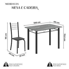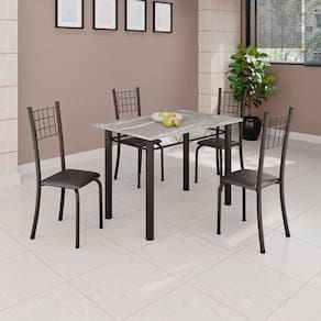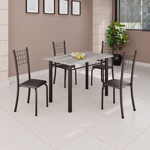 Quer deixar sua casa completa e prática? Uma dica bacana de como transformar o seu lar, deixando-o mais receptivo e bonito? Então você precisa de móveis indispensáveis para deixar seu lar muito mais aconchegante, receptivo e sempre disponível para receber a visita de amigos, familiares e convidados. Você vai se apaixonar por este incrível e moderno Conjunto de Mesa com 4 Cadeiras. Ideal para cozinha, ele é a melhor opção para completar o espaço que você desejar. Aproveite!! Medida da Mesa (A x L x P): 75,8 cm x 100 cm x 60 cm Peso da Mesa: 42,34 kg Mesa suporta até: 10.0000 Acabamento da Cadeira/Banco: Pintura Texturizada Acabamento da Mesa: Pintura Texturizada Ambiente Principal: Cozinha Cadeira/Banco estofada: Somente Assento Estofado Cadeira/Banco Estofada: Somente Assento Estofado Cadeira/Banco suporta até: 120.0000 codigo_ean: 7900288051585 Complexidade da Montagem: Baixa: pode ser montado por uma pessoa sozinha Cor: Preto Cor do Produto: Preto Cor Secundária: Cinza De Canto (Canto Alemão): Não Escala de Brilho: Semi-Brilho Espessura do Tampo: 1,5 mm Estrutura do Assento: MDP Formato do Tampo: Retangular Itens Inclusos: 1 Mesa, 4 Cadeiras, 1 Kit Ferragens + Manual de Montagem Linha ou Coleção: Dany Manual de Montagem e Instalação: https://product-hub-prd.madeiramadeira.com.br/975727/documents/027aa9cd-c452-460e-becb-7009f3a04f962645612352817375766831192.pdf Marca: Soma Móveis Material da Base da Mesa: Aço Material da Estrutura da Cadeira: Aço Material do Tampo: Granito Medida da Cadeira/Banco (A x L x P): 95 cm x 37 cm x 40 cm Medida do Tampo (L x C x E): 60 cm x 100 cm x 1,5 cm Mesa Extensível: Não Necessita Montagem: Sim Origem do Produto: Nacional Peso da Cadeira/Banco: 2,94 kg Possui Apoio Para os Pés: Não Quantidade de Cadeiras: 4 Quantidade de Lugares: 04 Recomendações de Uso, Manutenção e Limpeza: Não permitir que molhe os pés da base, usar um pano de tecido macio e seco, evitar detergentes, alvejantes e produtos químicos de limpeza; no tampo usar tecido macio levemente umedecido. Sistema de Montagem: Parafusos