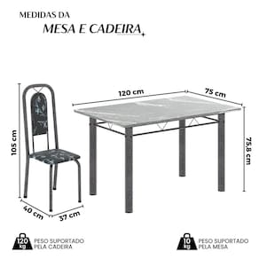 Quer deixar sua casa completa e prática? Uma dica bacana de como transformar o seu lar, deixando-o mais receptivo e bonito? Então você precisa de móveis indispensáveis para deixar seu lar muito mais aconchegante, receptivo e sempre disponível para receber a visita de amigos, familiares e convidados. Você vai se apaixonar por este incrível e moderno Conjunto de Mesa com 4 Cadeiras. Ideal para cozinha, ele é a melhor opção para completar o espaço que você desejar. Aproveite!! Medida da Mesa (A x L x P): 75,8 cm x 120 cm x 75 cm Peso da Mesa: 54,8 kg Mesa suporta até: 10.0000 Acabamento da Cadeira/Banco: Pintura Texturizada Acabamento da Mesa: Pintura Texturizada Ambiente Principal: Cozinha Cadeira/Banco Estofada: Somente Assento Estofado Cadeira/Banco estofada: Somente Assento Estofado Cadeira/Banco suporta até: 120.0000 codigo_ean: 7900288093240 Complexidade da Montagem: Baixa: pode ser montado por uma pessoa sozinha Cor: Preto / Prata Cor do Produto: Preto / Prata Cor Secundária: Cinza De Canto (Canto Alemão): Não Escala de Brilho: Semi-Brilho Espessura do Tampo: 1,5 mm Estrutura do Assento: MDP Formato do Tampo: Retangular Itens Inclusos: 1 Mesa + 4 Cadeiras + 1 Kit Ferragens + 1 Manual de Montagem Linha ou Coleção: Lara Manual de Montagem e Instalação: https://product-hub-prd.madeiramadeira.com.br/981815/documents/f4928701-0b63-4f97-b250-f204f8c6b4a62751668352817423268707839.pdf Marca: Soma Móveis Material da Base da Mesa: Aço Material da Estrutura da Cadeira: Aço Material do Tampo: Granito Medida da Cadeira/Banco (A x L x P): 105 cm x 37 cm x 40 cm Medida do Tampo (L x C x E): 120cm x 75cm x 1,5 cm Mesa Extensível: Não Necessita Montagem: Sim Origem do Produto: Nacional Peso da Cadeira/Banco: 2,7 kg Possui Apoio Para os Pés: Não Quantidade de Cadeiras: 4 Quantidade de Lugares: 04 Recomendações de Uso, Manutenção e Limpeza: Não permitir que molhe os pés da base, usar um pano de tecido macio e seco, evitar detergentes, alvejantes e produtos químicos de limpeza; no tampo usar tecido macio levemente umedecido. Sistema de Montagem: Parafusos