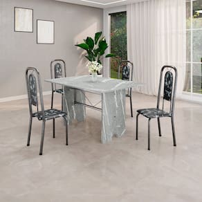 Quer deixar sua casa completa e prática? Uma dica bacana de como transformar o seu lar, deixando-o mais receptivo e bonito? Então você precisa de móveis indispensáveis para deixar seu lar muito mais aconchegante, receptivo e sempre disponível para receber a visita de amigos, familiares e convidados. Você vai se apaixonar por este incrível e moderno Conjunto de Mesa com 4 Cadeiras. Ideal para cozinha, ele é a melhor opção para completar o espaço que você desejar. Aproveite!! Medida da Mesa (A x L x P): 75,8 cm x 120 cm x 75 cm Peso da Mesa: 80,25 kg Mesa suporta até: 10.0000 Acabamento da Cadeira/Banco: Pintura Texturizada Acabamento da Mesa: Pintura Texturizada Ambiente Principal: Cozinha Cadeira/Banco Estofada: Somente Assento Estofado Cadeira/Banco estofada: Somente Assento Estofado Cadeira/Banco suporta até: 120.0000 codigo_ean: 7900288117298 Complexidade da Montagem: Baixa: pode ser montado por uma pessoa sozinha Cor: Preto/Prata Cor do Produto: Preto/Prata Cor Secundária: Cinza De Canto (Canto Alemão): Não Escala de Brilho: Semi-Brilho Espessura do Tampo: 1,5 mm Estrutura do Assento: MDP Formato do Tampo: Retangular Itens Inclusos: 1 Mesa, 6 Cadeiras, Manual de Montagem e Kit Ferragens Linha ou Coleção: Lara Manual de Montagem e Instalação: https://product-hub-prd.madeiramadeira.com.br/992494/documents/07eb92e3-8345-486a-bf25-a17cb83f6c172823687352817442347349606.pdf Marca: Soma Móveis Material da Base da Mesa: Aço Material da Estrutura da Cadeira: Aço Material do Tampo: Granito Medida da Cadeira/Banco (A x L x P): 105 cm x 37 cm x 40 cm Medida do Tampo (L x C x E): 120cm x 75cm x 1,5 cm Mesa Extensível: Não Necessita Montagem: Sim Origem do Produto: Nacional Peso da Cadeira/Banco: 2,7 kg Possui Apoio Para os Pés: Não Possui Suporte Giratório: Não Quantidade de Cadeiras: 4 Quantidade de Lugares: 04 Recomendações de Uso, Manutenção e Limpeza: Não permitir que molhe os pés da base, usar um pano de tecido macio e seco, evitar detergentes, alvejantes e produtos químicos de limpeza; no tampo usar tecido macio levemente umedecido. Sistema de Montagem: Parafusos