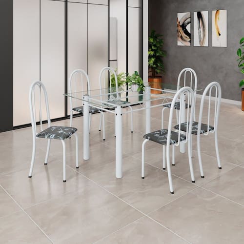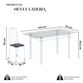 completar o espaço que você desejar. Aproveite!! Medida da Mesa (A x L x P): 75,6 cm x 140 cm x 75cm Peso da Mesa: 22,26 kg Mesa suporta até: 10.0000 Acabamento da Cadeira/Banco: Pintura Texturizada Acabamento da Mesa: Pintura Texturizada Ambiente Principal: Sala de Jantar Cadeira/Banco estofada: Somente Assento Estofado Cadeira/Banco Estofada: Somente Assento Estofado Cadeira/Banco suporta até: 120.0000 codigo_ean: 7900288062871 Complexidade da Montagem: Baixa: pode ser montado por uma pessoa sozinha Cor: Preto / Branco Cor do Produto: Preto / Branco Cor Secundária: Cinza De Canto (Canto Alemão): Não Escala de Brilho: Brilhante Espessura do Tampo: 6 mm Espessura do Vidro: 6 mm Estrutura do Assento: MDP Formato do Tampo: Retangular Itens Inclusos: 1 Mesa + 6 Cadeiras + 1 Kit Ferragens + Manual de Montagem Linha ou Coleção: Iris B Manual de Montagem e Instalação: https://product-hub-prd.madeiramadeira.com.br/976430/documents/8dfcc314-65b3-4887-9856-ac4518f25ca32653848352817381021070967.pdf Marca: Soma Móveis Material da Base da Mesa: Aço Material da Estrutura da Cadeira: Aço Material do Tampo: Vidro Medida da Base (A x L x P): 75cm x 63,5 cm x 108 cm Medida da Cadeira/Banco (A x L x P): 96 cm x 36 cm x 41 cm Medida do Tampo (L x C x E): 75 cm x 140 cm x 0,6 cm Mesa Extensível: Não Necessita Montagem: Sim Origem do Produto: Nacional Peso da Cadeira/Banco: 3,88 kg Possui Apoio Para os Pés: Não Possui Suporte Giratório: Não Quantidade de Cadeiras: 6 Quantidade de Lugares: 06 Recomendações de Uso, Manutenção e Limpeza: Não permitir que molhe os pés da base, usar um pano de tecido macio e seco, evitar detergentes, alvejantes e produtos químicos de limpeza; no tampo usar tecido macio levemente umedecido. Sistema de Montagem: Parafusos Vidro Temperado: Sim