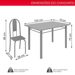 Escala de brilho: Semi-BrilhoCadeira estofada com espuma D-16, revestimento em couro ecológicoMedidas da Mesa (A x L x P): 75 cm x 60 cm x 100 cmMedidas da Base (A x L x P): 74,3 cm x 73 cm x 54 cmMedida do Tampo (L x C x E): 60 cm x 100 cm X 1,5 cmMedida da Cadeira (A x L x P): 96 cm x 36 cm x 41 cmMaterial da Base da Mesa: AçoPeso da Cadeira: 4,28 KgCadeira suporta até: 120 KgAcabamento da Cadeira: Pintura TexturizadaMaterial da Estrutura da Cadeira: AçoEstrutura do Encosto e Assento: MDP de 15mm c/ couríssimoPeso da Mesa: 41,74 KgAcabamento da Mesa: Pintura TexturizadaMesa suporta até: 8 KgMaterial do Tampo: GranitoEspessura do Tampo : 2,5mmSistema de Montagem: ParafusosFormato: Retangular