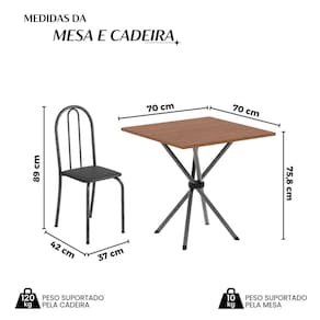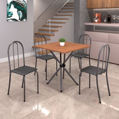 completar o espaço que você desejar. Aproveite!! Medida da Mesa (A x L x P): 75,8 cm x 70cm X 70cm Peso da Mesa: 6,53 kg Mesa suporta até: 10.0000 Acabamento da Cadeira/Banco: Pintura Texturizada Acabamento da Mesa: Pintura Texturizada Ambiente Principal: Cozinha Cadeira/Banco Estofada: Somente Assento Estofado Cadeira/Banco estofada: Somente Assento Estofado Cadeira/Banco suporta até: 120.0000 codigo_ean: 7900288121875 Complexidade da Montagem: Baixa: pode ser montado por uma pessoa sozinha Cor: Preto / Martelado Prata Cor do Produto: Preto / Martelado Prata Cor Secundária: Cinza De Canto (Canto Alemão): Não Escala de Brilho: Semi-Brilho Espessura do Tampo: 1,5 mm Estrutura do Assento: MDP Formato do Tampo: Quadrado Itens Inclusos: 1 Mesa, 4 Cadeiras, Kit Ferragens e Manual de Montagem Linha ou Coleção: Ane B Manual de Montagem e Instalação: https://product-hub-prd.madeiramadeira.com.br/690009293/documents/d762a965-2626-4a9c-a703-a2b5aef00b6d22699287352817399065305255.pdf Marca: Soma Móveis Material da Base da Mesa: Aço Material da Estrutura da Cadeira: Aço Material do Tampo: MDF Medida da Base (A x L x P): 75 cm x 49cm² Medida da Cadeira/Banco (A x L x P): 89 cm x 37 cm x 42 cm Medida do Tampo (L x C x E): 70 cm x 70 cm x 1,5 cm Mesa Extensível: Não Necessita Montagem: Sim Origem do Produto: Nacional Peso da Cadeira/Banco: 3 kg Possui Apoio Para os Pés: Não Quantidade de Cadeiras: 4 Quantidade de Lugares: 04 Recomendações de Uso, Manutenção e Limpeza: Não permitir que molhe os pés da base, usar um pano de tecido macio e seco, evitar detergentes, alvejantes e produtos químicos de limpeza; no tampo usar tecido macio levemente umedecido. Sistema de Montagem: Parafusos