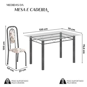 Quer deixar sua casa completa e prática? Uma dica bacana de como transformar o seu lar, deixando-o mais receptivo e bonito? Então você precisa de móveis indispensáveis para deixar seu lar muito mais aconchegante, receptivo e sempre disponível para receber a visita de amigos, familiares e convidados. Você vai se apaixonar por este incrível e moderno Conjunto de Mesa com 4 Cadeiras. Ideal para cozinha, ele é a melhor opção para completar o espaço que você desejar. Aproveite!! Medida da Mesa (A x L x P): 75,8 cm x 120 cm x 75 cm Peso da Mesa: 19,15 kg Mesa suporta até: 10 kg Acabamento da Cadeira/Banco: Pintura Texturizada Acabamento da Mesa: Pintura Texturizada Ambiente Principal: Cozinha Cadeira/Banco estofada: Encosto e Assento Estofados Cadeira/Banco suporta até: 120 kg codigo_ean: 7900288145130 Complexidade da Montagem: Baixa: pode ser montado por uma pessoa sozinha Cor: Arabesco / Prata Cor do Produto: Arabesco / Prata Cor Secundária: Bege De Canto (Canto Alemão): Não Enchimento do Assento: Espuma D-16 Escala de Brilho: Brilhante Espessura do Tampo: 6 mm Espessura do Vidro: 6 mm Estrutura do Assento: MDP Formato do Tampo: Retangular Itens Inclusos: 1 Mesa, 4 Cadeiras, Manual de Montagem e Kit Ferragens Linha ou Coleção: Lara Manual de Montagem e Instalação: https://cdn2.madeiramadeira.com.br/atributo/soma-moveis-ltda/2818001-3528-17441405246925.pdf Marca: Soma Móveis Material da Base da Mesa: Aço Material da Estrutura da Cadeira: Aço Material do Tampo: Vidro Medida da Cadeira/Banco (A x L x P): 105 cm x 37 cm x 40 cm Medida do Tampo (L x C x E): 120cm x 75cm x 0,6 cm Mesa Extensível: Não Necessita Montagem: Sim Origem do Produto: Nacional Peso da Cadeira/Banco: 2,7 kg Possui Apoio Para os Pés: Não Quantidade de Cadeiras: 4 Quantidade de Lugares: 04 Recomendações de Uso, Manutenção e Limpeza: Não permitir que molhe os pés da base, usar um pano de tecido macio e seco, evitar detergentes, alvejantes e produtos químicos de limpeza; no tampo usar tecido macio levemente umedecido. Revestimento da Cadeira/Banco: Couro Ecológico Sistema de Montagem: Parafusos Vidro Temperado: Sim