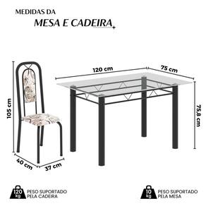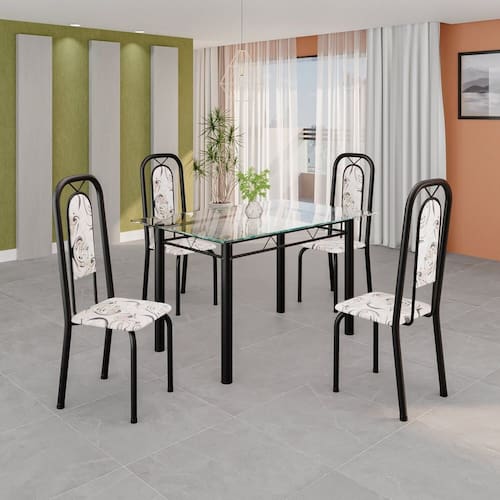 Quer deixar sua casa completa e prática? Uma dica bacana de como transformar o seu lar, deixando-o mais receptivo e bonito? Então você precisa de móveis indispensáveis para deixar seu lar muito mais aconchegante, receptivo e sempre disponível para receber a visita de amigos, familiares e convidados. Você vai se apaixonar por este incrível e moderno Conjunto de Mesa com 4 Cadeiras. Ideal para cozinha, ele é a melhor opção para completar o espaço que você desejar. Aproveite!! Medida da Mesa (A x L x P): 75,8 cm x 120 cm x 75 cm Peso da Mesa: 19,15 kg Mesa suporta até: 10 kg Acabamento da Cadeira/Banco: Pintura Texturizada Acabamento da Mesa: Pintura Texturizada Ambiente Principal: Cozinha Cadeira/Banco estofada: Encosto e Assento Estofados Cadeira/Banco suporta até: 120 kg codigo_ean: 7900288145246 Complexidade da Montagem: Baixa: pode ser montado por uma pessoa sozinha Cor: Arabesco / Preto Cor do Produto: Arabesco / Preto Cor Secundária: Bege De Canto (Canto Alemão): Não Enchimento do Assento: Espuma D-16 Escala de Brilho: Semi-Brilho Espessura do Tampo: 6 mm Espessura do Vidro: 6 mm Estrutura do Assento: MDP Formato do Tampo: Retangular Itens Inclusos: 1 Mesa, 4 Cadeiras, Manual de Montagem e Kit Ferragens Linha ou Coleção: Lara Manual de Montagem e Instalação: https://cdn2.madeiramadeira.com.br/atributo/soma-moveis-ltda/2818001-3528-17441405246925.pdf Marca: Soma Móveis Material da Base da Mesa: Aço Material da Estrutura da Cadeira: Aço Material do Tampo: Vidro Medida da Cadeira/Banco (A x L x P): 105 cm x 37 cm x 40 cm Medida do Tampo (L x C x E): 120cm x 75cm x 0,6 cm Mesa Extensível: Não Necessita Montagem: Sim Origem do Produto: Nacional Peso da Cadeira/Banco: 2,7 kg Possui Apoio Para os Pés: Não Quantidade de Cadeiras: 4 Quantidade de Lugares: 04 Recomendações de Uso, Manutenção e Limpeza: Não permitir que molhe os pés da base, usar um pano de tecido macio e seco, evitar detergentes, alvejantes e produtos químicos de limpeza; no tampo usar tecido macio levemente umedecido. Revestimento da Cadeira/Banco: Couro Ecológico Sistema de Montagem: Parafusos Vidro Temperado: Sim