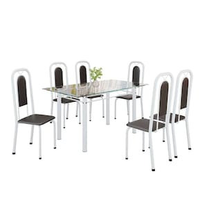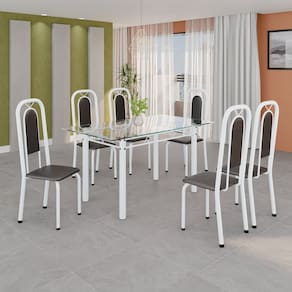 Quer deixar sua casa completa e prática? Uma dica bacana de como transformar o seu lar, deixando-o mais receptivo e bonito? Então você precisa de móveis indispensáveis para deixar seu lar muito mais aconchegante, receptivo e sempre disponível para receber a visita de amigos, familiares e convidados. Você vai se apaixonar por este incrível e moderno Conjunto de Mesa com 6 Cadeiras. Ideal para cozinha, ele é a melhor opção para completar o espaço que você desejar. Aproveite!! Medida da Mesa (A x L x P): 75,8 cm x 140 cm x 75 cm Peso da Mesa: 21,35 kg Mesa suporta até: 10.0000 Acabamento da Cadeira/Banco: Pintura Texturizada Acabamento da Mesa: Pintura Texturizada Ambiente Principal: Cozinha Cadeira/Banco Estofada: Encosto e Assento Estofados Cadeira/Banco estofada: Encosto e Assento Estofados Cadeira/Banco suporta até: 120.0000 codigo_ean: 7900288146380 Complexidade da Montagem: Baixa: pode ser montado por uma pessoa sozinha Cor: Preto / Branco Cor do Produto: Preto / Branco Cor Secundária: Cinza De Canto (Canto Alemão): Não Enchimento do Assento: Espuma D-16 Escala de Brilho: Brilhante Espessura do Tampo: 6 mm Espessura do Vidro: 6 mm Estrutura do Assento: MDP Formato do Tampo: Retangular Itens Inclusos: 1 Mesa, 6 Cadeiras, Manual de Montagem e Kit Ferragens Linha ou Coleção: Lara Manual de Montagem e Instalação: https://product-hub-prd.madeiramadeira.com.br/920695804/documents/889afb85-ada5-4c61-a748-6ee8717618fae2821966352817442234269539.pdf Marca: Soma Móveis Material da Base da Mesa: Aço Material da Estrutura da Cadeira: Aço Material do Tampo: Vidro Medida da Cadeira/Banco (A x L x P): 105 cm x 37 cm x 40 cm Medida do Tampo (L x C x E): 140cm x 75cm x 0,6cm Mesa Extensível: Não Necessita Montagem: Sim Origem do Produto: Nacional Peso da Cadeira/Banco: 2,7 kg Possui Apoio Para os Pés: Não Quantidade de Cadeiras: 6 Quantidade de Lugares: 06 Recomendações de Uso, Manutenção e Limpeza: Não permitir que molhe os pés da base, usar um pano de tecido macio e seco, evitar detergentes, alvejantes e produtos químicos de limpeza; no tampo usar tecido macio levemente umedecido. Revestimento da Cadeira/Banco: Couro Ecológico Sistema de Montagem: Parafusos Vidro Temperado: Sim