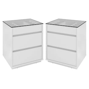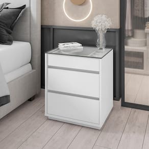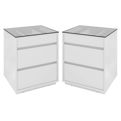 Feitos em MDP 25/15mm. Possui 3 gavetas com corrediças telescópicas possibilitando a abertura total da gaveta com deslizamento suave preciso e resistente e tampo feito de vidro.