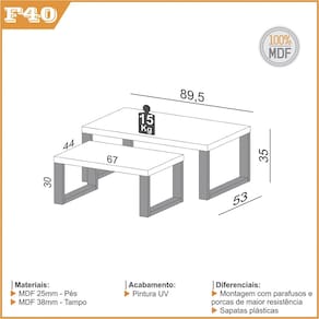 Dimensões: Mesa de Centro Maior Altura: 30 cm Largura: 67 cm Profundidade: 44 cm