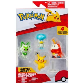 O conjunto Pokémon Paldea Battle Figure 4 Pack reúne quatro mini figuras de aproximadamente 5 cm de altura cada, representando Pikachu, Fuecoco, Sprigatito e Quaxly em versões de batalha, com pintura colorida e detalhes inspirados na série animada Pokémon. As figuras vêm em poses fixas, são fornecidas prontas para uso, sem necessidade de montagem, e podem ser utilizadas tanto em brincadeiras quanto como itens de coleção ou decoração.