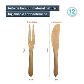Esse conjunto é composto por 12 peças: 6 unidades de MINI GARFOS DE BAMBU- OIKOS Comprimento: 9 cm Largura: 1 cm
