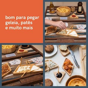 Bem bacana para receber amigos em casa e pegar porções de pastinhas, patês, mel e até comida para criança. Com um design que vai na mesa, confere um toque rústico na composição, provocado pelo seu tom natural. Higiênico, esse conjunto carrega as propriedades antibactericidas do bambu, só precisa lavar e secar de acordo com as recomendações, combinado?