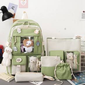 - ??O pacote inclui?Conjunto de 5 peças: 1 mochila, 1 bolsa de ombro, 1 caixa de lápis, 1 sacola, 1 bolsa pequena com cordão. Vem com 4 pingentes de pelúcia e um conjunto de pinos (cores e estilos aleatórios). Você também pode fazer você mesmo o lindo conjunto de mochilas com outros acessórios kawaii que você tem.