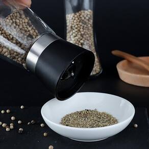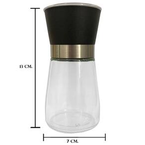O nosso moedor é feito de vidro transparente, que permite ver o conteúdo e a quantidade de tempero. Ele tem uma tampa de plástico preto, que possui um mecanismo de moagem de metal, que tritura os grãos de forma rápida e uniforme. Ele tem uma capacidade de 180ml e um tamanho de 13x7cm, que se adapta a qualquer espaço e ocasião.
