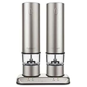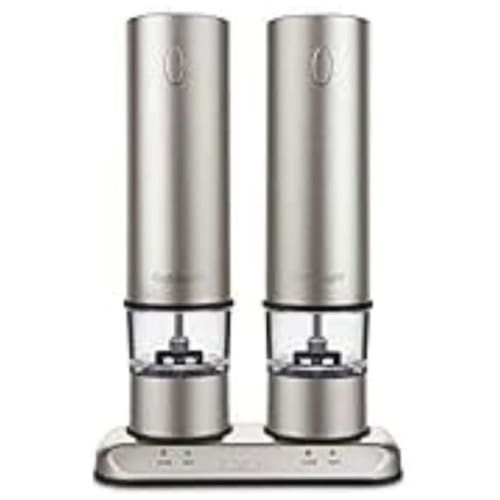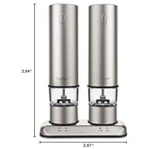 Detalhes Estes moinhos de sal e pimenta recarregáveis da Cuisinart são uma maneira fácil e elegante de servir sal e pimenta moídos na hora. Os moinhos têm uma base de energia elegante e estão sempre totalmente carregados. O LED acende quando eles estão carregando e quando estão prontos. Moinhos se ajustam para moagem fina a curso As luzes indicadoras de carga e pronto acendem quando no carregador Recipientes porta especiarias transparentes facilitam a verificação dos níveis de sal e pimenta em um relance Aço inoxidável escovado com logotipo Marca: Não Informado
