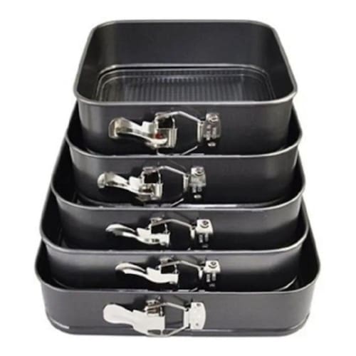 5 MOLDES QUADRADOS DE TEFLON ANTIADERENTES REPOST-FACTURER Moldes antiaderentes para bolos, ideais para fazer bolos quadrados e obter um acabamento espetacular. Seu design inovador não permite que os preparativos grudem no molde, facilitando a realização de qualquer coisa. Os moldes podem ser desmontados usando um fecho de segurança, o que facilita a limpeza e a desmontagem da preparação. Além disso, os moldes podem ser colocados um dentro do outro para facilitar o armazenamento. Dimensões das laterais dos moldes quadrados: 20, 22, 24, 26 e 28 cm. Meça a altura de cada molde: cerca de 7 cm.