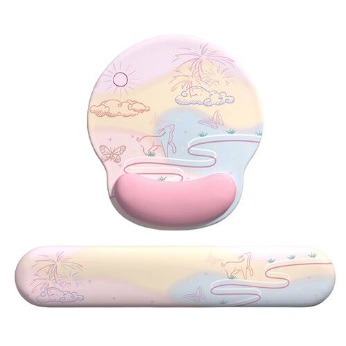 Material: silicone e tecido de seda leitosa Tamanho: mouse pad 225* 250 mm* 25 mm; bandeja de teclado 440* 80* 25 mm Peso: 350 g Design pastel extravagante: com uma paisagem pastel onírica com coelhos, borboletas e nuvens, este conjunto de mouse pad adiciona um toque sereno e criativo à sua mesa, perfeito para um espaço de trabalho tranquilo. Suporte ergonômico de pulso: tanto o mouse pad quanto o suporte para teclado são projetados com suportes de pulso de silicone integrados, garantindo conforto e reduzindo a tensão no pulso durante longas horas de digitação e uso do mouse. Materiais de qualidade premium: feito com uma combinação de silicone e tecido de seda leitosa, este conjunto oferece uma superfície lisa e macia para movimentos fáceis do mouse e digitação precisa. Base antiderrapante para estabilidade: a base de silicone antiderrapante mantém o mouse pad e o teclado apoiados com segurança no lugar, evitando qualquer movimento enquanto você trabalha ou joga. Perfeito para casa ou escritório: com um tamanho de mouse pad de 225 mm x 250 mm e um tamanho de descanso de teclado de 440 mm x 80 mm, este conjunto é ideal para criar um espaço de trabalho funcional e elegante em qualquer casa ou escritório.