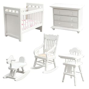 Material: madeira compensada Peso: 210 g Dimensões: Cama: 11,2 cm de comprimento x 7 cm de largura x 8,2 cm de altura; Cadeira de jantar: 4,7 cm de comprimento x 4,3 cm de largura x 10 cm de altura; Cadeira de balanço: 6,7 cm de comprimento x 5 cm de largura x 10,2 cm de altura; Cavalo de balanço: 7 cm de comprimento x 3,5 cm de largura x 5,8 cm de altura; Armário: 9,7 cm de comprimento x 4,0 cm de largura x 7,4 cm HighThis conjunto de móveis em miniatura em escala 1:12 inclui um berço branco, cômoda, cadeira alta, cadeira de balanço e cavalo de balanço, todos feitos de madeira compensada. Perfeito para adicionar um toque realista à sua casa de bonecas, berçário ou quarto infantil, com móveis charmosos de estilo vintage. Feitas com detalhes finos e acabamento durável, essas peças são ideais para criar um espaço de estar em miniatura aconchegante e elegante. Não é para crianças pequenas: este é um modelo de brinquedo e peças pequenas podem representar risco de asfixia ou causar ferimentos. Nota sobre o produto: Este conjunto foi projetado para uso em casas de bonecas e não para uso humano real. Se encaixa perfeitamente em casas de bonecas e miniaturas em escala 1:12.