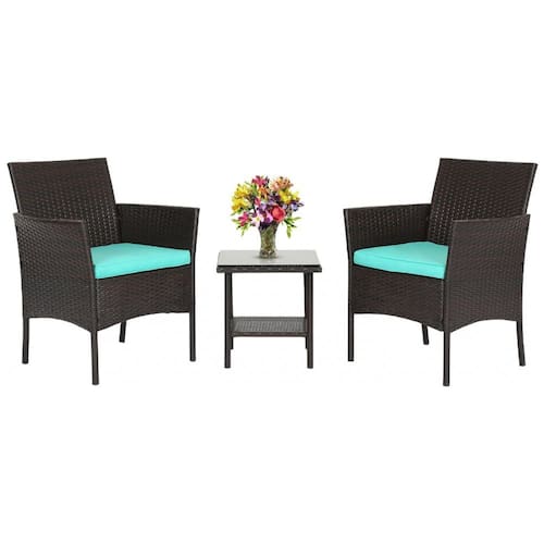 Receba em uma caixa: 2 x Almofadas Grossas, 1 x Mesa de Café com Tampo de Vidro Temperado (40.64cm x 40.64cm x 40.64cm), 2 x Cadeiras de Vime (58.42cm x 58.42cm x 83.82cm). As almofadas possuem esponja de alta densidade para maior conforto. A mesa é ideal para bebidas, alimentos e decorações. Montagem rápida e fácil, com todas as ferramentas necessárias inclusas. Perfeito para pequenos espaços externos, como varandas. Ótima escolha para áreas como varandas, jardins, piscinas, entre outros. Estrutura resistente de aço com vime de PE resistente às intempéries. Mesa lateral elegante e simples, perfeita para relaxar ao ar livre. Dimensões das cadeiras: 58.42cm x 58.42cm x 83.82cm, Dimensões da mesa: 40.64cm x 40.64cm x 40.64cm.