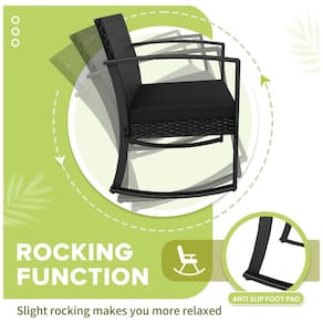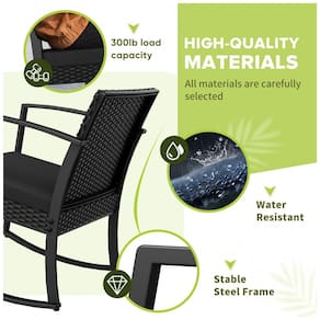 Desfrute de momentos de lazer ao ar livre com a família e amigos neste conjunto de móveis de pátio. As confortáveis cadeiras de balanço, feitas de resina de alta qualidade, proporcionam uma atmosfera relaxante. Com almofadas de 2 polegadas para assentos macios, estrutura robusta de aço revestido e mesa de café requintada, este conjunto é ideal para bate-papos e momentos tranquilos. Fácil de montar e limpar, é perfeito para varandas, pátios e jardins.