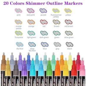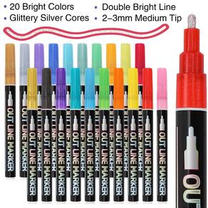 - ? Marcadores brilhantes premium e exclusivos: o conjunto de canetas metálicas Muchcute Outline tem 20 cores brilhantes variadas. As canetas de contorno de linha dupla projetadas com tecnologia exclusiva produzirão automaticamente contornos para você criar um lindo efeito de duas cores. E pode desenhar 3 efeitos diferentes em papel de cor clara, papel preto e superfície lisa. Vamos fazer você mesmo projetos de arte exclusivos em duas cores hoje mesmo!
