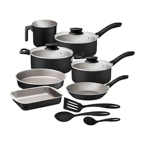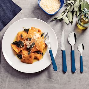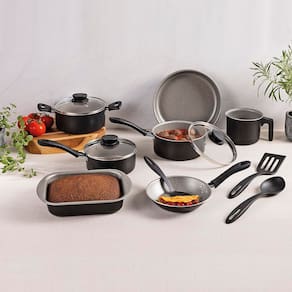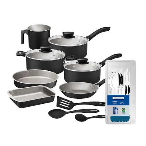 O Conjunto Tramontina Linz Starflon Max 10 Peças Preto + Faqueiro Leme 12 Peças Inox Azul. Não é só um kit completo, é um casamento perfeito, que une a resistência das panelas Tramontina com a funcionalidade e durabilidade dos talheres Tramontina Leme.