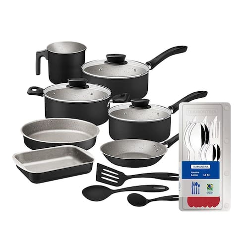 O Conjunto Tramontina Linz Starflon Max 10 Peças Preto + Faqueiro Leme 12 Peças Inox Vermelho. Não é só um kit completo, é um casamento perfeito, que une a resistência das panelas Tramontina com a funcionalidade e durabilidade dos talheres Tramontina Leme.