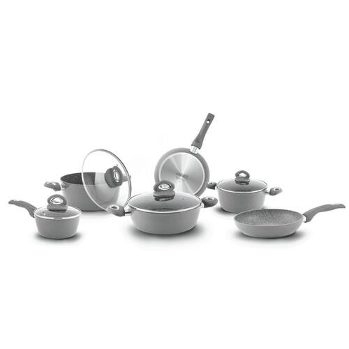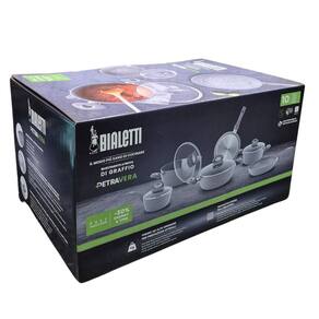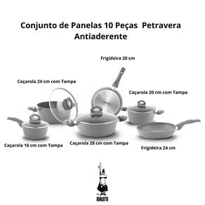 Pode ser usada em qualquer tipo de Fogão, inclusive de Indução Economia de 30% de tempo e energia Excelente e longa vida útil Alta resistência a abrasões Grande resistência a manchas Praticidade e versatilidade no uso Perfeito para uso sem óleo ou gordura (necessita apenas de selagem inicial e ocasional) Fácil limpeza e manutenção (podem ir à lava-louças) 100 % níquel free e pfoa free. Composição do conjunto de panelas com 10 Peças: Panela 16 cm com tampa Caçarola 20 cm com tampa Caçarola 24 cm com tampa Caçarola 28cm com tampa Frigideira 20 cm Frigideira 24 cm. Marca: Bialetti Petravera
