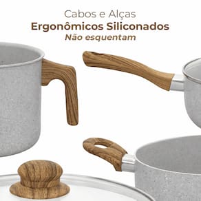 As peças do conjunto possuem cabos e alças com acabamento siliconado Soft-Touch amadeirado, que dão um toque macio e não esquentam, evitando acidentes.
